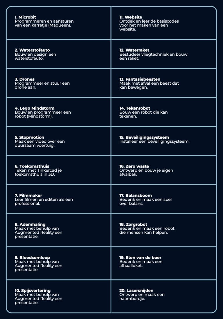 Op onderstaande afbeelding ziet u welke 20 activiteiten we in het technieklokaal mee aan de slag kunnen gaan. We hebben er zin in! Als we richting Ede gaan hebben we ook ouders nodig voor de begeleiding. Daarvoor ziet u binnenkort verzoekjes in de agenda verschijnen.